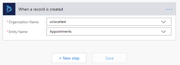 Create a blank flow and use the Dynamics 365 trigger for when a record is created. The Organization Name field will be your organization name. The Entity Name field will be Appointments. An example of what this looks like is shown below: