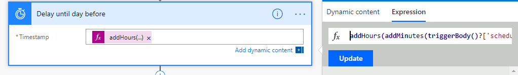 addHours(addMinutes(triggerBody()?[‘scheduledstart’], -1),-24)