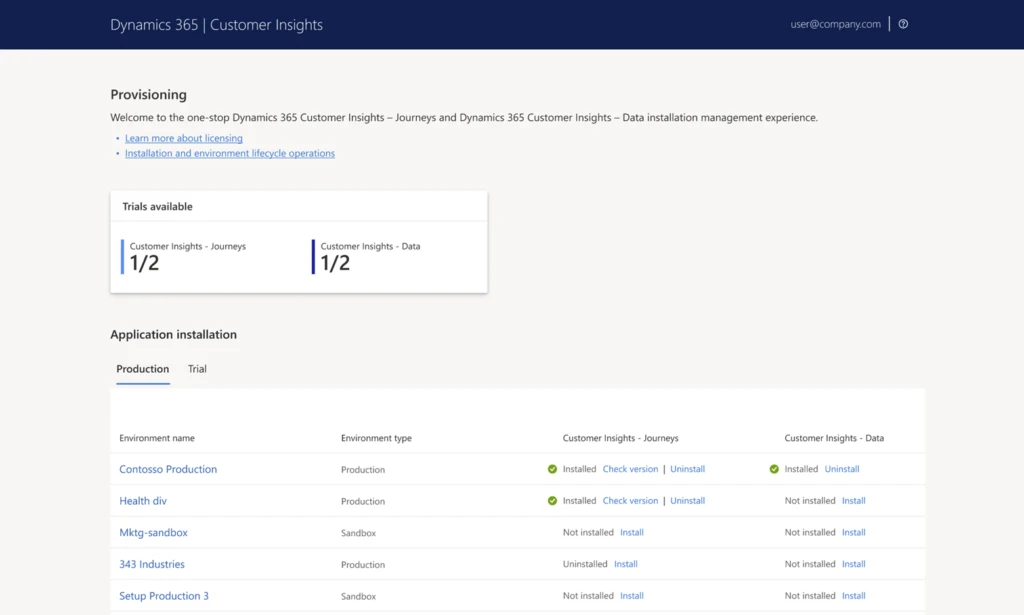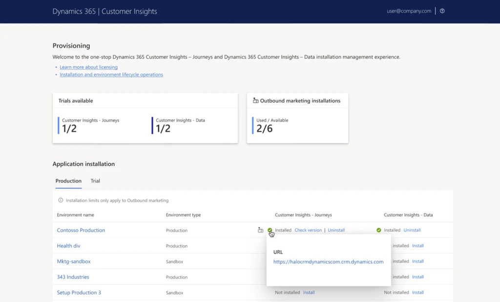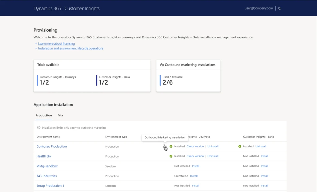 After June 30, 2024, as an admin, you have unlimited application installs with Customer Insights – Journeys (real-time only) and Customer Insights – Data on as many production and sandbox environments in the Power Platform Admin Center as you’d like. Admins with a paid Dynamics 365 Customer Insights license on their tenant (i.e. production or sandbox environments) will no longer see the application installation counter and limits. See details on how to install Customer Insights. Customer Insights –Journeys, application install limits still apply to additional installations of legacy outbound marketing solutions. (This accommodates the high cost of the background services.) For customers using only real-time Journeys, there is no installation limit.