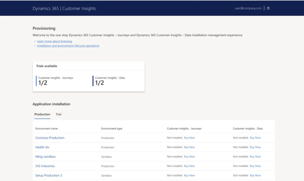 • If your tenant does not have any Dynamics 365 Customer Insights or Marketing licenses, you see a view which offers you links to learn how to buy.