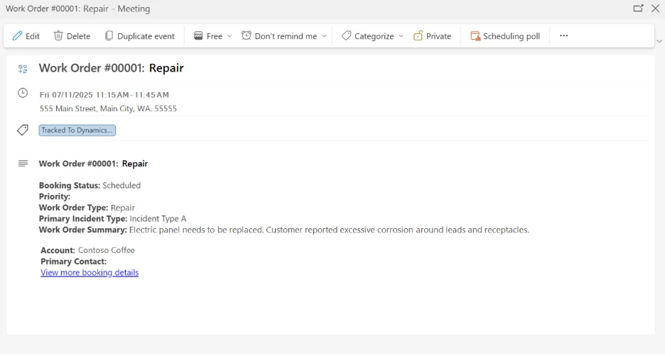 - Work order bookings appear automatically in Outlook and Teams calendars.