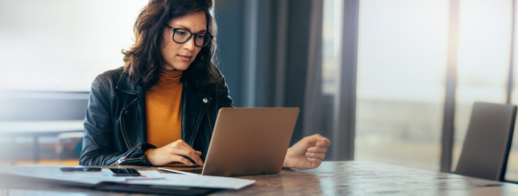 Asian business woman sitting at a table in an office, typing on her laptop with focus. Young female professional showing a dedication and commitment to her project at work.