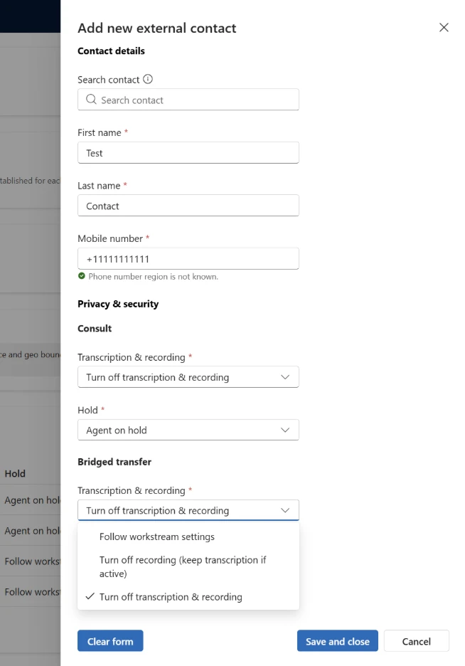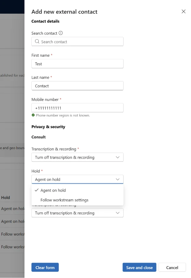Secure numbers are created by applying specific settings to a contact. During runtime, the platform enforces the necessary protections instantly — without requiring manual intervention. The settings are flexible, and can be applied to only consult or transfer, or both. For consult and transfer the administrator can decide to follow workstream recording & transcription settings, stop recording but continue transcription, or stop both transcription & recording. Additionally, during consult, administrators can choose to either put their representatives on hold, or follow workstream settings to have the customer placed on hold with the representative able to take them off.