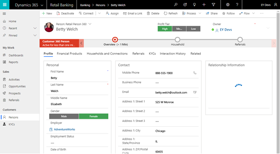 From the Dashboard, Relationship Manager can navigate to specific customer record to review Customer 360 Form. Customer 360 Form presents all necessary information to help the Relationship Manager make informed decisions. Sample Customer 360 forms include information such as profile details, financial products customer has with the bank, household information, interaction history etc. The data can come from multiple sources such as CRM and/or core banking systems through multiple integration options available in Business Application Platform
