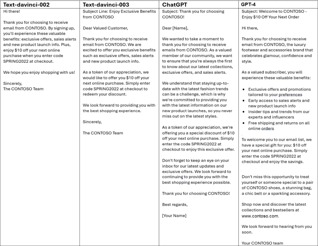 As with the IRS example, GPT-4 provides the most detailed response, including a bullet list of benefits. It even added an encouragement not to miss the opportunity, implicitly understanding that a coupon code should have a time component.