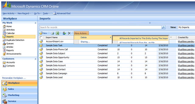 Scenario 1: User imported a zip file containing multiple csv files and later realized that one of the source data file had some invalid data. He wants to delete imported data of that particular record type from CRM Online. This can be very easily achieved with following steps: