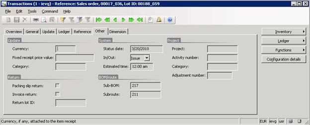 From the sales order line, select Inventory > Transaction to preview inventory transactions for the sales order lines and verify that a Sub-BOM and Subroute has been applied for the inventory transaction as well.