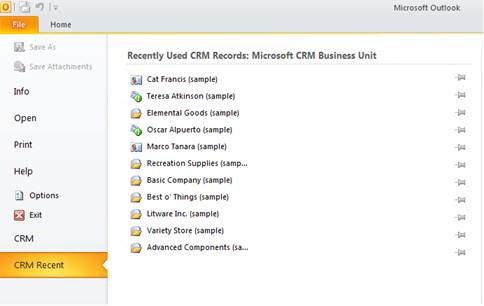 If you like this feature as much as I do, and if you are using the Microsoft Outlook Client you most likely want to use it there too. To get to the Recently Visited List in Outlook go to the File Tab and click on CRM Recent. BTW, the recently visited items will be the same ones you see when using the web client. So if you happen to use both you won’t lose your list!