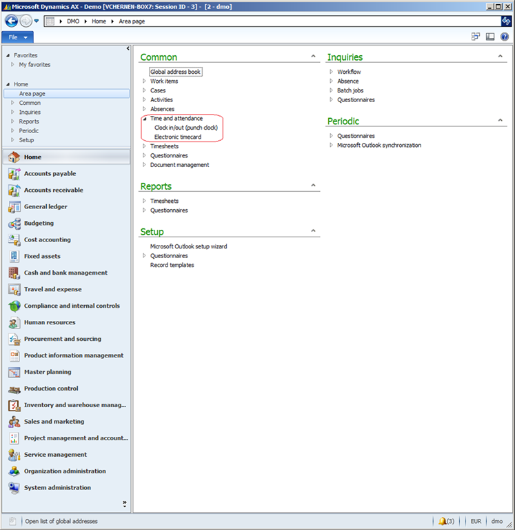 The Time and attendance features are moved to the Human resources module and the features can be accessed through the Human resources area page. The related menu items are located in Time and attendance groups under Common, Reports, Inquiries, Periodic and Setup. There is also a Time registration workers list page menu item under the Workers group in the Common area.