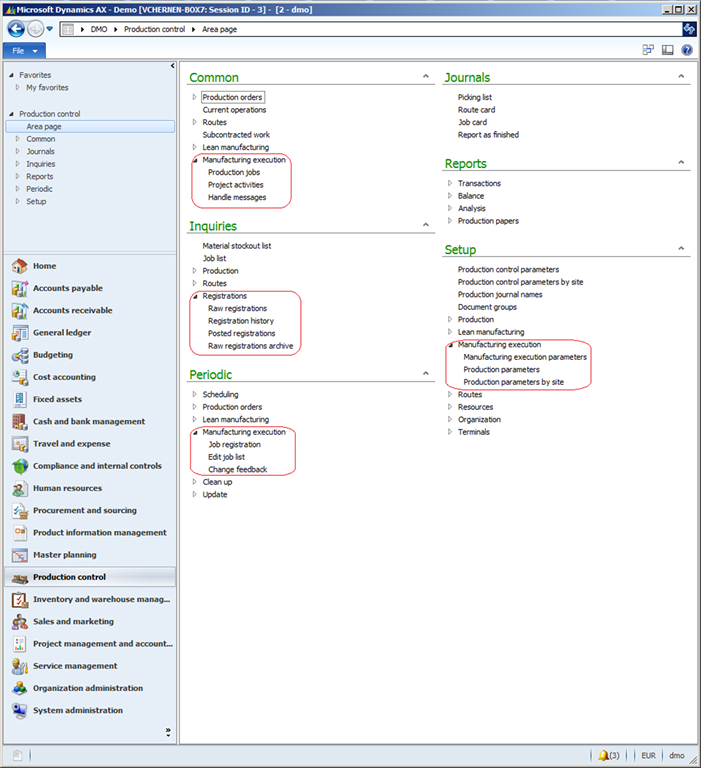 The menu items for Manufacturing execution are located on the Production control area page in the Manufacturing execution groups under Common, Periodic and Setup and in the Registration group under Inquiries