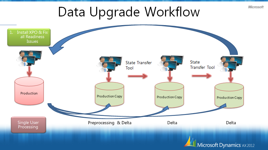 To find out how to use the upgrade state transfer tool, see Using the preprocessing upgrade state transfer tool or obtain the Microsoft Dynamics AX 2012 Upgrade Guide (http://newed.any0.dpdns.org/download/en/details.aspx?id=14599) from the Microsoft Download Center and search in the file for the section titled “Using the pre processing upgrade state transfer tool.” Read through the entire section carefully for detailed information on how to setup the live production system and the test system to support running this process.