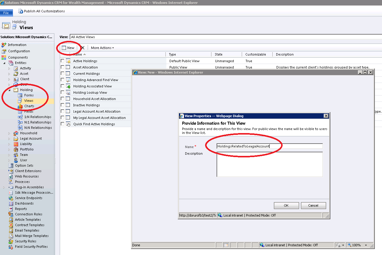 We start by opening our solution and navigating to the Holding Entity. Here we will create a new View. We will modify this view later using Fetch XML to enable seeing related Holdings in the Legal Account form. For the purpose of this exercise I named the view “HoldingsRelatedToLegalAccount”. We click OK after entering the name and click Save & Close on the new window.