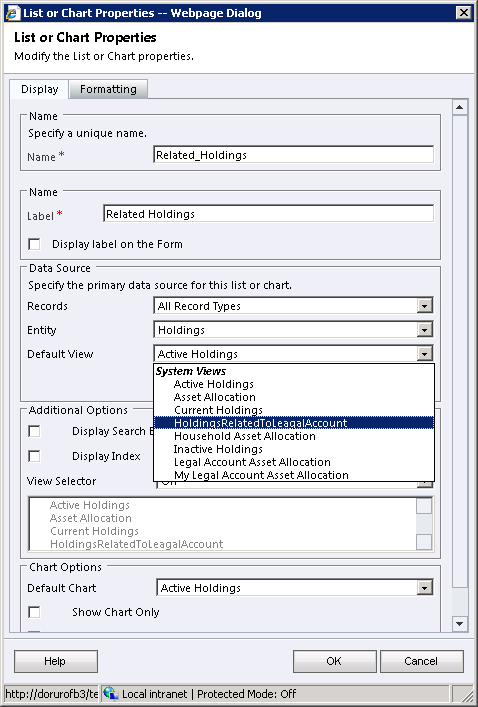 We give a Name and a Label,and, most importantly we choose HoldingsRelatedToLegalAccount as the default View.  Also, select “All Record Types” for the Records dropdown and “Holdings” for the Entity dropdown. In other words we will see all the Holdings in the system regardless of whether they are related to the currently opened Legal Account or not. We will modfy this via Fetch XML later so that only related Holdings will be shown.