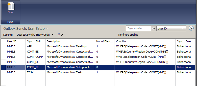 The scenario is as follows. We want to split the Dynamics NAV contacts of person type in Belgium ones and Dutch ones. We first delete the CONT_PERS entity. To do so, start up RTC and select CRONUS International Ltd./Departments/Administration/Application Setup/Microsoft Office Outlook Integration/Outlook Synch. User Setup. Manually select all lines and either press CTRL+DEL or right click and select Delete. Second step is to delete the CONT_PERS entity. To do so, follow these steps. In RTC, select CRONUS International Ltd./Departments/Administration/Application Setup/Microsoft Office Outlook Integration/Outlook Synch. Entities, select CONT_SP and press CTRL+SHIFT+E or right click the entity and select Delete. Confirm the deletion that collections will be updated automatically.