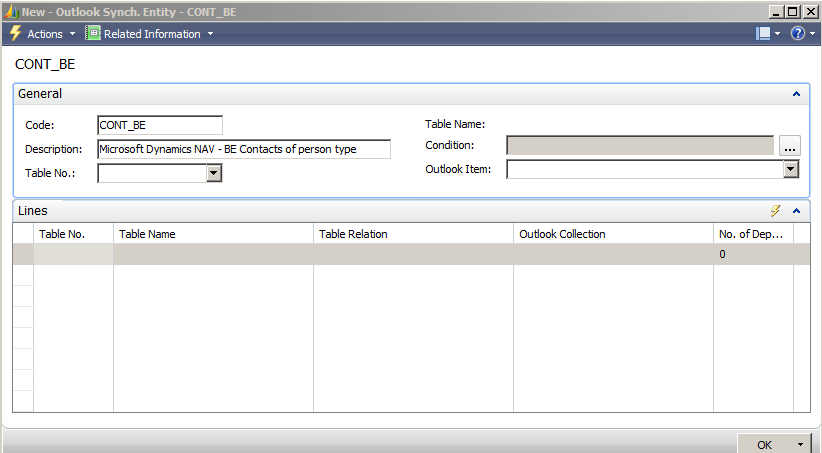 Result of this is that we now have the following standard entities: CONT_SP, CONT_COMP, TASK and APP. Let us now create a two new entities. In RTC, select CRONUS International Ltd./Departments/Administration/Application Setup/Microsoft Office Outlook Integration/Outlook Synch. Entities, press New and type in a unique code and a unique description. E.g.: