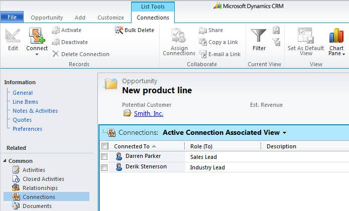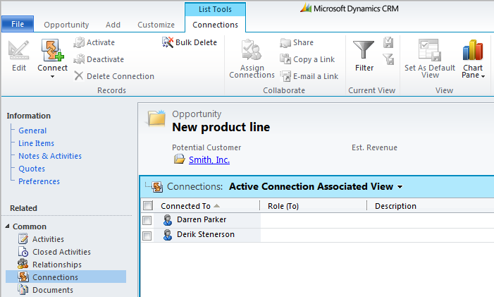 Note: You may want to customize the Opportunity form to add Connections as a sub-grid, to make viewing this data inline easier.