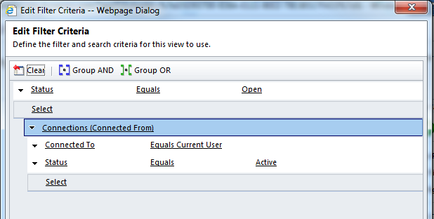 Here’s where I ran into a bit of a snag. I had intended to just modify the “My Open Opportunities” Public View to add an OR clause such that it would show effectively “Owner Equals Current User OR Connected to Current User”. Of course, the problem is that the filter criteria doesn’t allow creating OR expressions across entities, so I couldn’t add the clauses to include Connections.