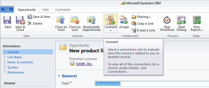 Here’s where the strength of the Connections capability that was introduced in CRM 2011 comes into play. Connections allow you relate records together of all types – in a way it’s like an “any to any” relationship, with an added ability to annotate the relationship with the meaning of the relationship, or other notes. For example, you can use it to identify a contact as your “Colleague” or express the roles of the various contacts that are associated to an opportunity such as “Influencer” or “Decision Maker”.