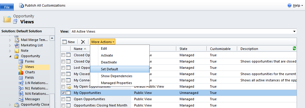 4. Be sure to mark this new Public view as the Default view by choosing “Set Default” from the More Actions menu for the list of views. This way, users will see the desired records by default.