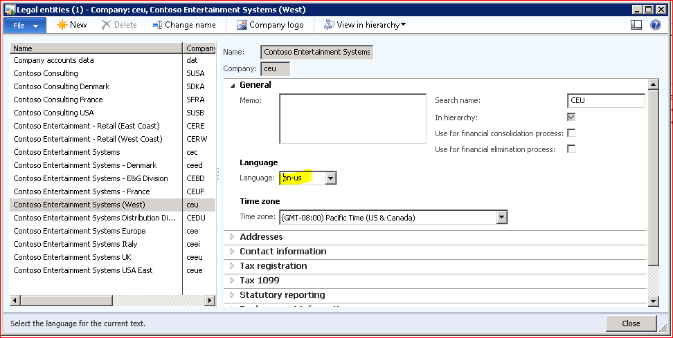 For Company-specific workflows – navigate to Organization Administration > Setup > Organization > Legal Entities and check the Language field: