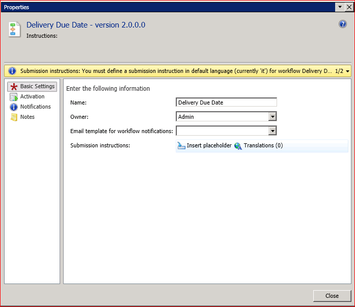 When trying to create a new workflow configuration, you may find that text boxes are missing from the Properties form when you try to modify the basic settings. You are therefore unable to create a valid workflow configuration as you cannot input text for the submission instructions and other mandatory fields.