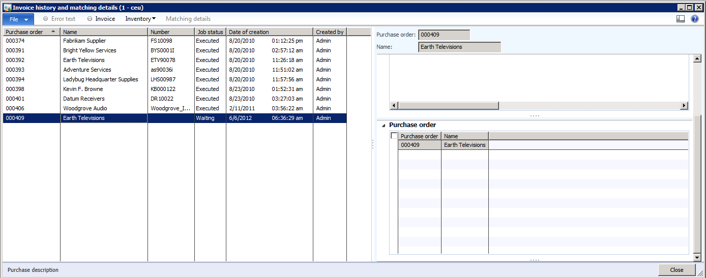 Accounts payable / Inquiries / History / Purchase orders / Invoice (or Invoice approval journal)