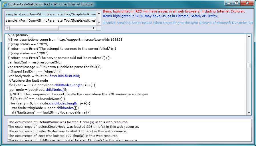 The purpose of this tool is to assist customers and partners of Microsoft Dynamics CRM identify potential issues with their custom JavaScript in JavaScript libraries and HTML web resources. The Microsoft Dynamics CRM Q4 2012 Service Update will include significant changes in the web application in order to be able to support a variety of browsers such as Safari, Chrome, and Firefox. When using JavaScript code in Dynamics CRM, it is possible that some code will stop working or cause an error when you upgrade.