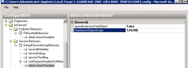 – Change property value MaxItemsInObjectGraph from 65536 to 534288: