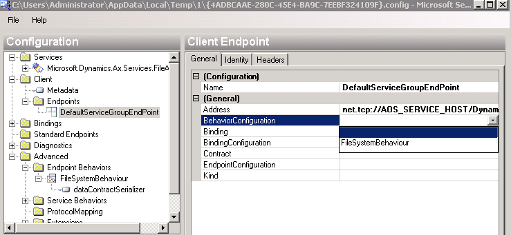– Select Client > Endpoints > DefaultServiceGroupEndpoint and change property: BehaviorConfiguration to FileSystemBehaviour:
