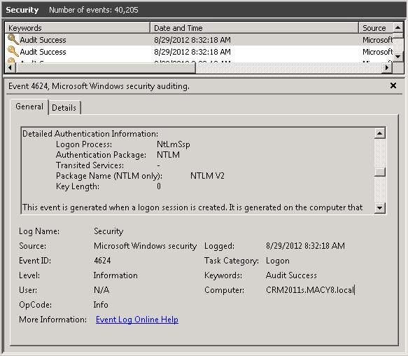 Authentication events are logged in the Security event log, which you can review by using the Event Viewer (Start, Run, ‘eventvwr’). The differences between NTLM-related security events and Kerberos-related security events are evident in a comparison of the following illustrations: