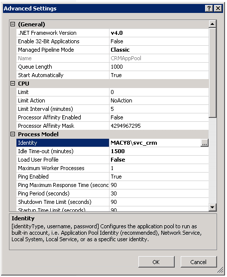 The Kerberos authentication happens under the credentials of the CRM website’s application pool. To enable the identity to perform authentication, it is important to know which identity is in use.