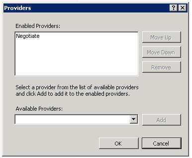 5. In the Providers dialog box, under Enabled Providers, verify that Negotiate appears as the first entry.