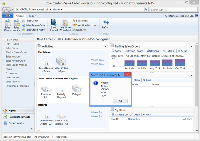 5. Run the codeunit from the Microsoft Dynamics NAV Development Environment. The Microsoft Dynamics NAV Windows client opens and the content of the Excel workbook is now read into the Excel Buffer table and presented to the user in a message box for each row.