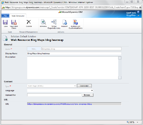 We will present our mapping visualization in the context of Dynamics CRM Online through the use of Web Resources. We will create one HTML Web Resource for our map, and we will also leverage a JavaScript Web Resource