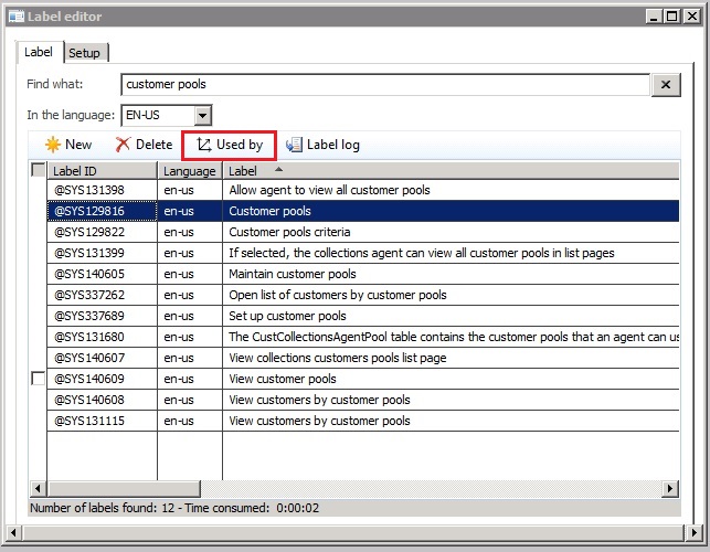 Note the same technique is also useful to find for example error messages in the application. Just take a note of the error message, find the label in the label editor and search through the AOT for the labelID to find the location in the code where the error message is produced from