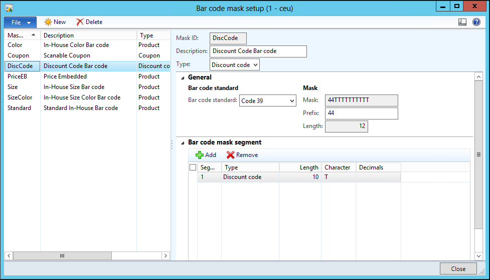 1. Set up the bar code masking: Retail > Setup > Bar codes and labels > Bar code mask setup (Example setup)