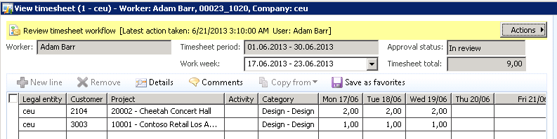 Review timesheet line workflow must be added to the main Review timesheet workflow, because it cannot operate on its own. To define Review timesheet line workflow: