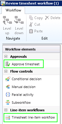 - Timesheet line-item workflow: It is used to define the approval at the detail line level. In such case, you should set up a new workflow of type Review timesheet line workflow and join the new workflow to this workflow element belonging to the main workflow type Review timesheet workflow.