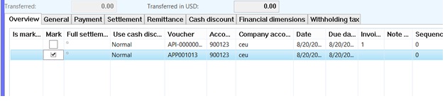 15. In the Settle Open Transactions form mark the Mark checkbox for the Payment Voucher that you are cancelling.