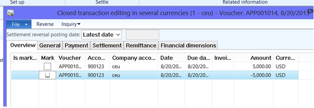 8. In the Settle Open Transactions form, you will see the invoice and payment vouchers that we previously reversed signifying that the link between the vouchers has been severed.