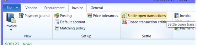 7. In the All Vendors list page click the Settle Open Transactions button in the Settle group of the Invoice tab to open the Settle Open Transactions form