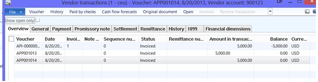 19. In the Vendor Transactions from note that there is a debit amount from the original payment and a new credit payment voucher for the same amount