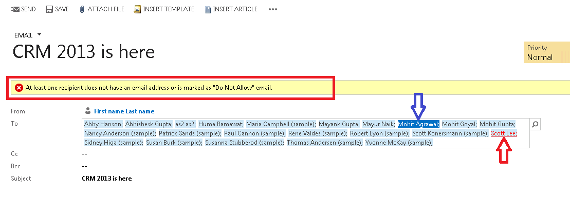 - If any Account/Contact/Lead record selected in the lookup field does not have primary mail ID defined, the lookup item text would be highlighted with Red Color and a warning notification will appear on top of Email form mentioning “At least one recipient does not have an email address or is marked as ‘Do Not Allow’ email.”