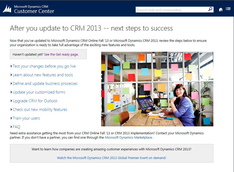 If you recently updated to CRM Online Fall ’13 or CRM 2013 (on-premises), you might be wondering what to do next to get rolling with the new features. You can find all sorts of useful information and tips on our new Next steps to success page.