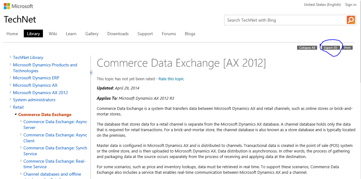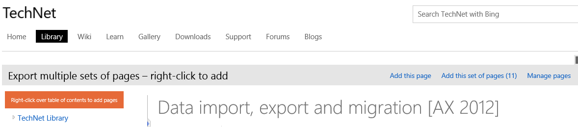 I’ll walk through a couple examples: creating a PDF of the Retail Commerce Data Exchange content, and creating a PDF on Master Data Management, which will include all of the AX 2012 R3 content about master data management, some SQL Server content about Master data services, and some AX 2012 R3 content about the Data Import/Export Framework. You can follow the same procedures, but substitute any content that meets your needs.