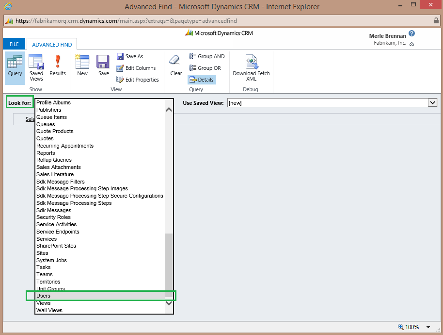Step 3: On the Advanced Find page, click the Look for: drop down as shown below and select Users