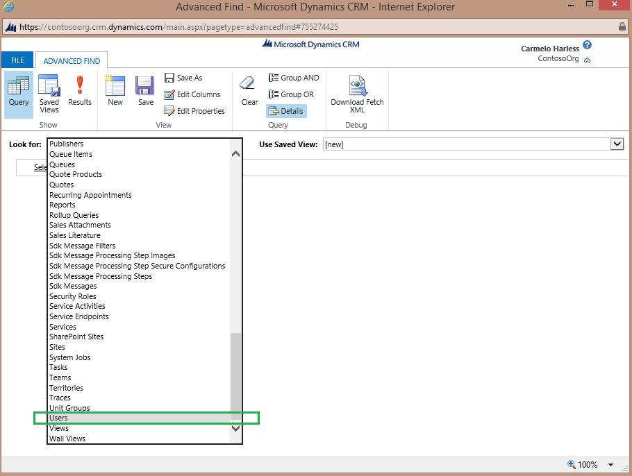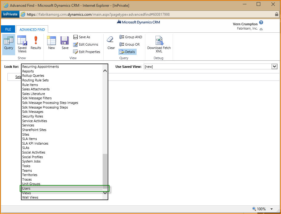 Step 3: On the Advanced Find page, click the Look for: drop down as shown below, scroll down and select Users