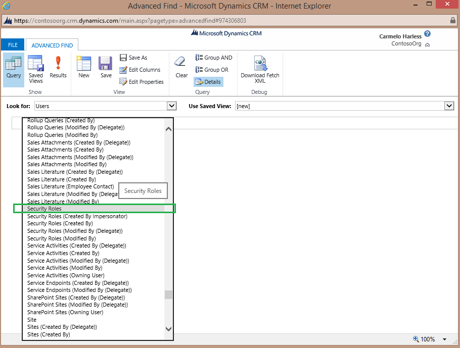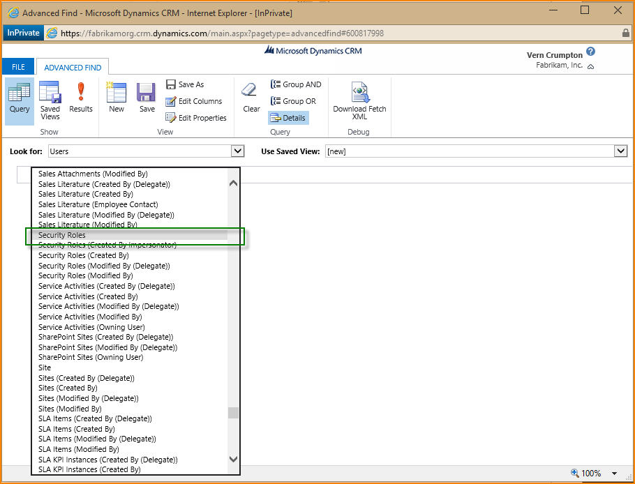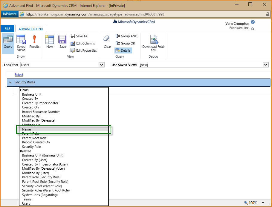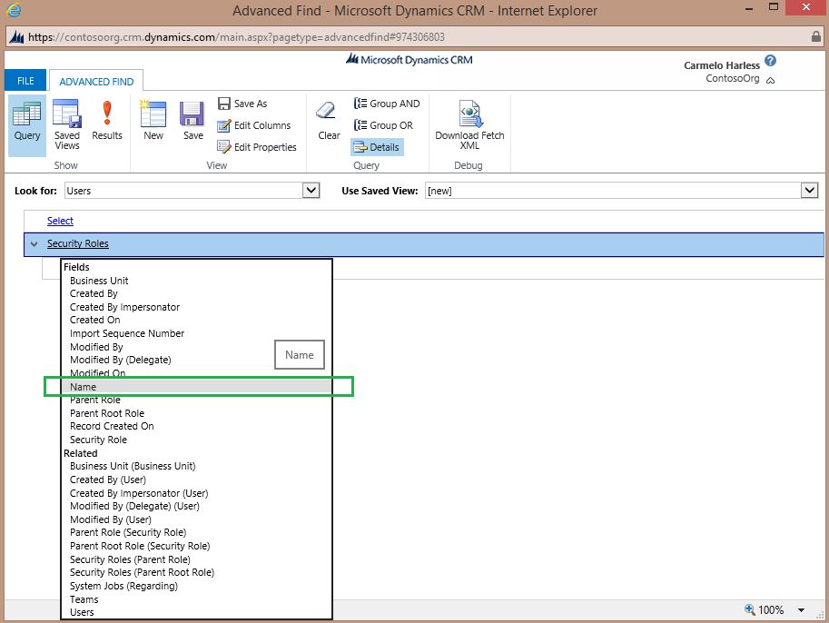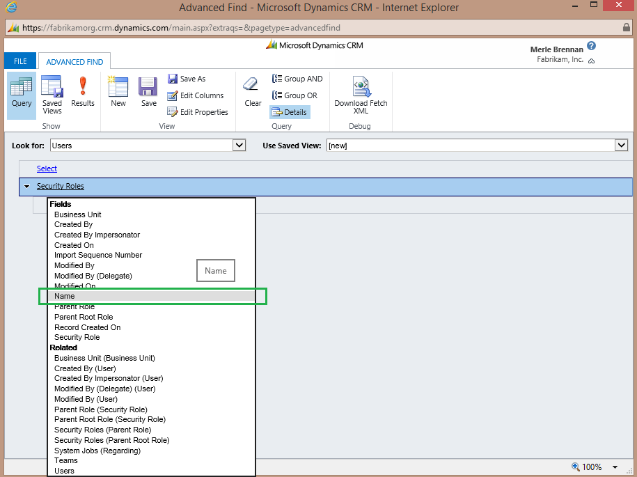 Step 5: After selecting Security Roles, under Fields select Name from the drop down