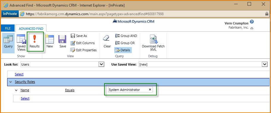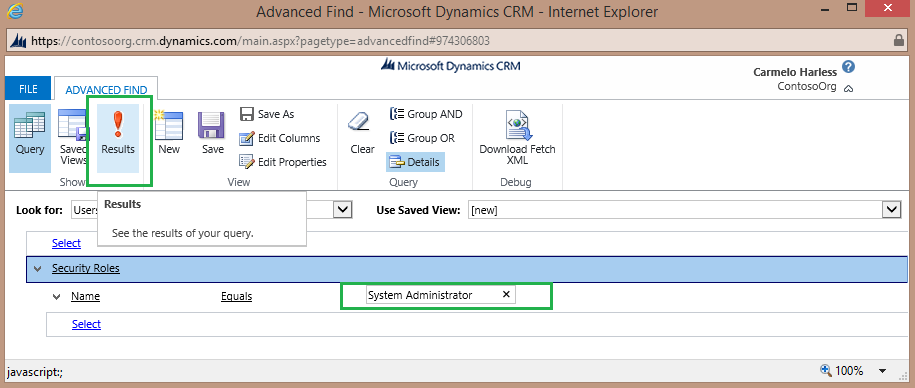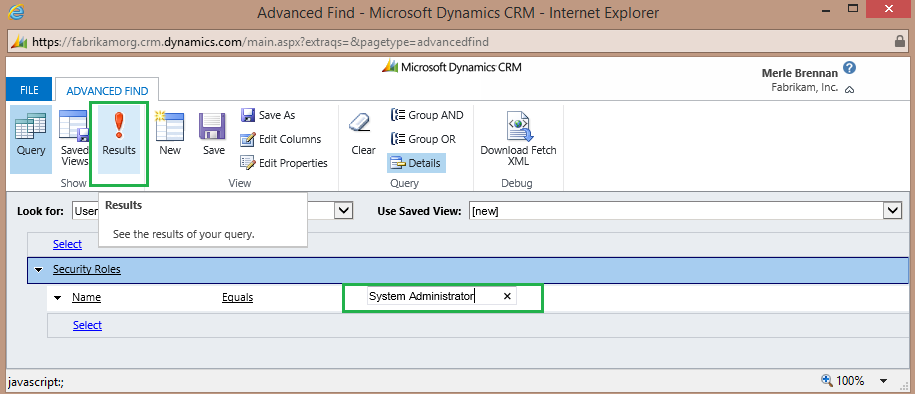 Step 5: Next, you will be asked to provide a search string in the enter text location, enter the string System Administrator and click the ‘Results’ button on the Advanced Find toolbar.