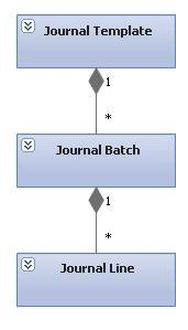 There is a 1:n aggregation relationship between journal templates and journal batches, as well as between journal batches and journal lines. Deleting a template will cascade deletion of the related batches and lines. Deleting a batch will cascade into deletion of related lines.